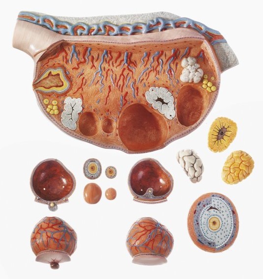 Le modèle montre une coupe horizontale au niveau du mésovarium avec représentation plastique des follicules à différents stades de maturité, du corps jaune (Corpus luteum) progestatif (coagulum central) et gestatif et du corps blanc (Corpus albicans) ainsi que les follicules atrétiques, en partie amovibles et échangeables.