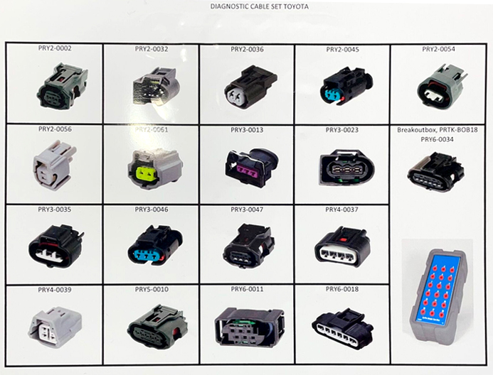 Kit pour le diagnostic TOYOTA, qui comprend une large gamme de câbles en Y, associés à une solution de dérivation, permettant aux techniciens d'effectuer des mesures précises directement sur les composants, sans avoir recours à des tests de continuité.