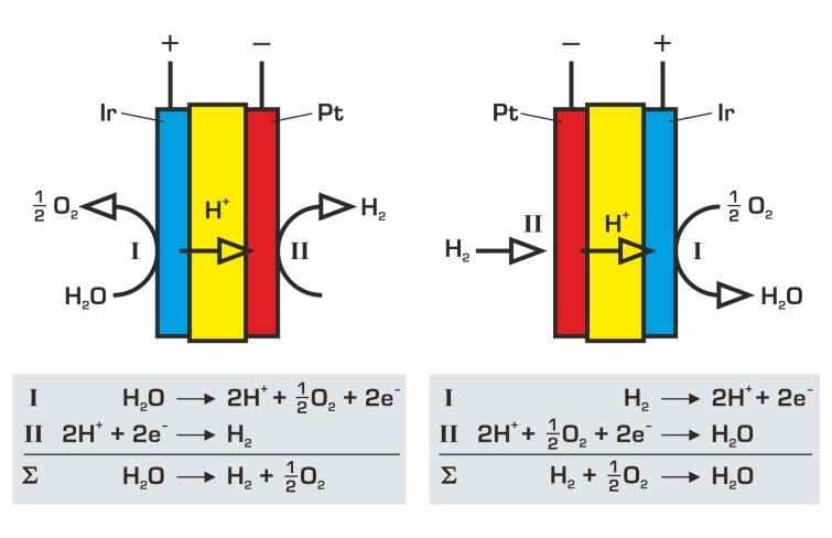 Leau (H2O) est alors décomposée en hydrogène (H2) et en oxygène (O2) à laide de la membrane échangeuse de protons (technologie PEM).
