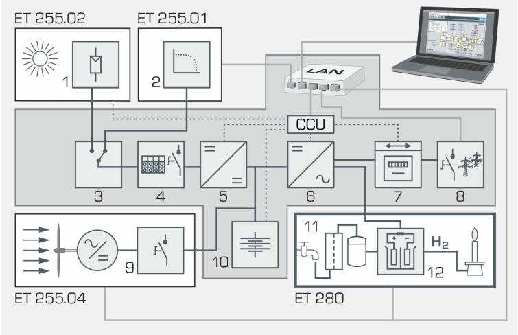 Le banc dessai ET 280 peut être utilisé avec le système énergétique pour lélectricité solaire et éolienne ET 255 et ses composants.
